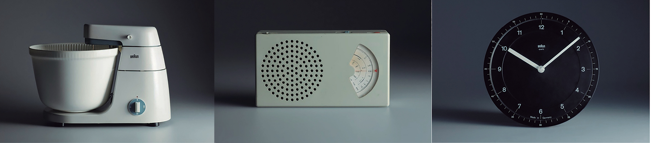 De izquierda a derecha: Mezcladora Portatil (1951), Radio P1 (1957) y Reloj de Pared (1954), productos diseñados por Dieter Rams para la firma Braun, a principios de los años 50.